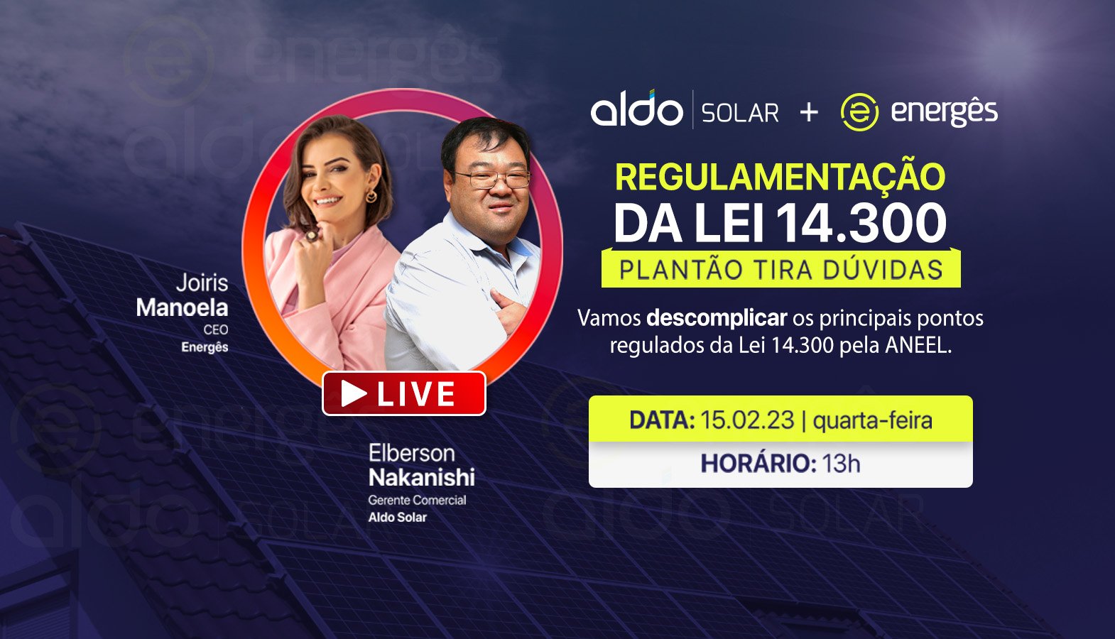 Saiba mais em detalhes ao participar do Plantão Tira Dúvidas sobre a Lei 14.300. Será ao vivo no dia 15 de fevereiro às 13h, com nosso Gerente Comercial, Elberson Nakanishi, e a CEO da Energês, Joiris Manoela. Não perca essa oportunidade única!